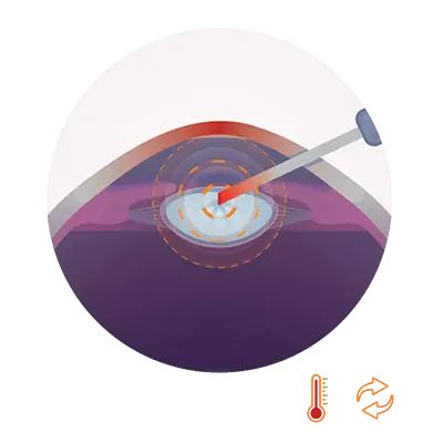 Mittels einer kleinen Ultraschallsonde wird der Linsenkern entfernt. Durch die Abgabe von Ultraschallenergie kann der Kern zerkleinert werden und wird über die Sonde abgesagt.