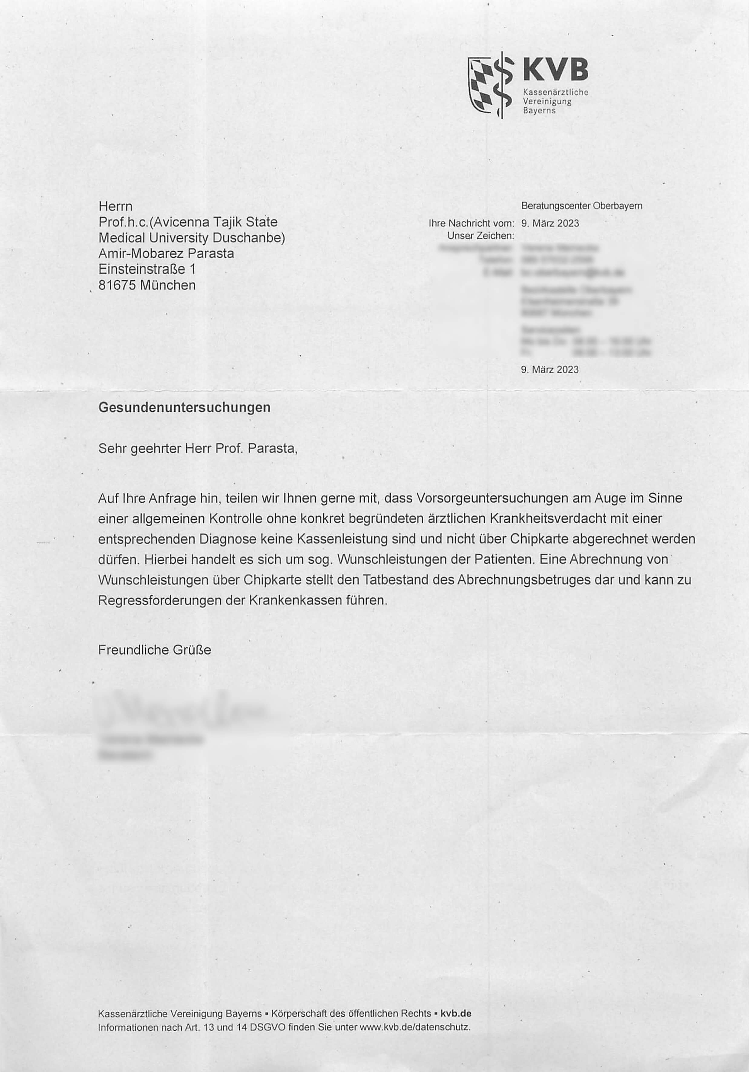 Die gesetzlichen Krankenkassen decken nur die Kosten für eine konkrete Krankheitsbehandlung ab. Augenchecks werden nicht von gesetzlichen Krankenkassen übernommen und können daher in dieser Sprechstunde NICHT geleistet werden. (Siehe hierzu: Schreiben der Kassenärztlichen Vereinigung)